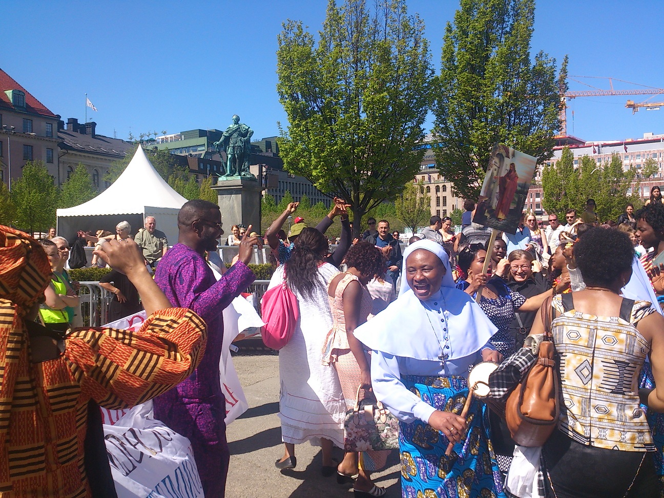 Afrikansk kör, Burundikören ochLovsångsteam från Holy Oasis Ministries medverkade på scenen och i vandringståget till Kungsträdgården.