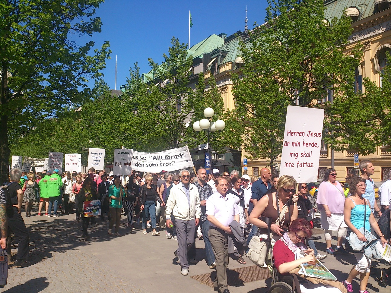 14.00 vandrade man från parkerna och torgen till Kungsträdgården och avslutningsgudstjänsten där som i år enl preliminära uppskattning samlade 18000 personer, något färre än fjolårets manifestation.