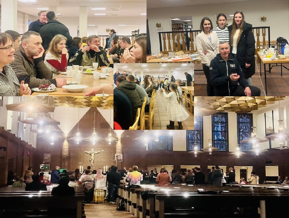 Afterwards, everyone was invited to the Cathedral Hall for social gathering and coffee. A vibrant group that has joined the charismatic community is [Catholics from the Greek Catholic Church in Ukraine], many involved in [the community The Risen Christ GALILEA]. The group had offered to arrange coffee, and it turned into a party with happy fellowship and a sumptuous coffee table where many families had contributed with baking and brought their gifts. Since the Mass was also the regular Sunday Vigil Mass in English in the Catholic Cathedral, many visitors who had not been present during the afternoon also came and participated in the celebration.